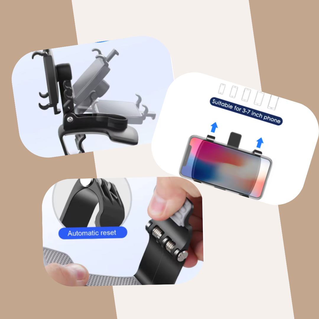 De houder kan eenvoudig bevestigd worden aan de achteruitkijkspiegel, zonneklep of op het dashboard van de auto.